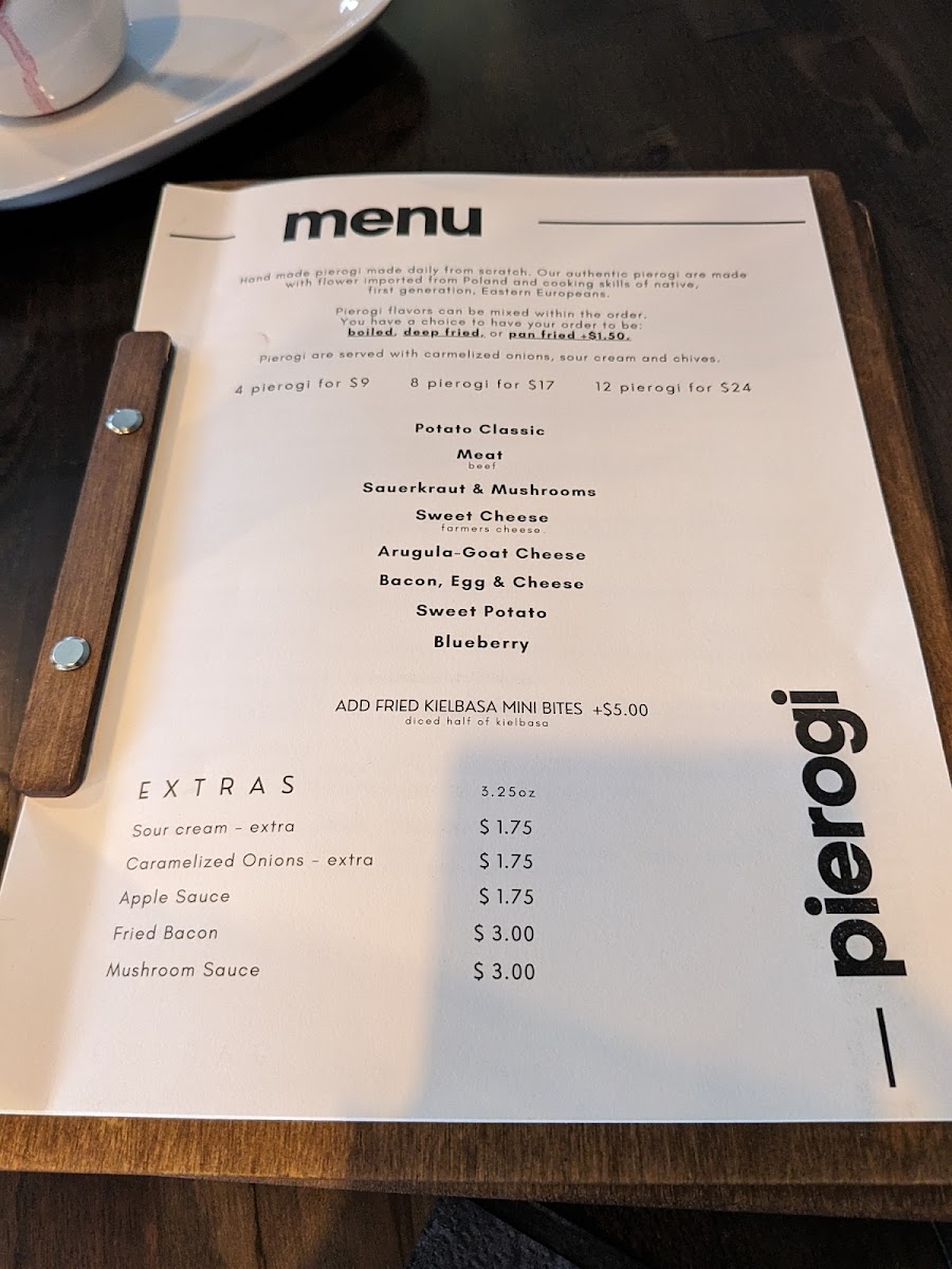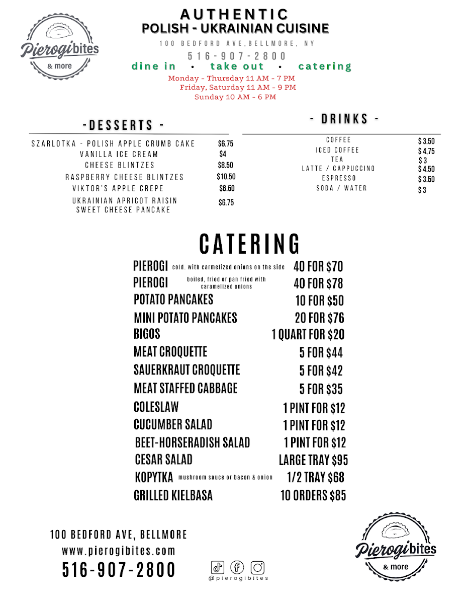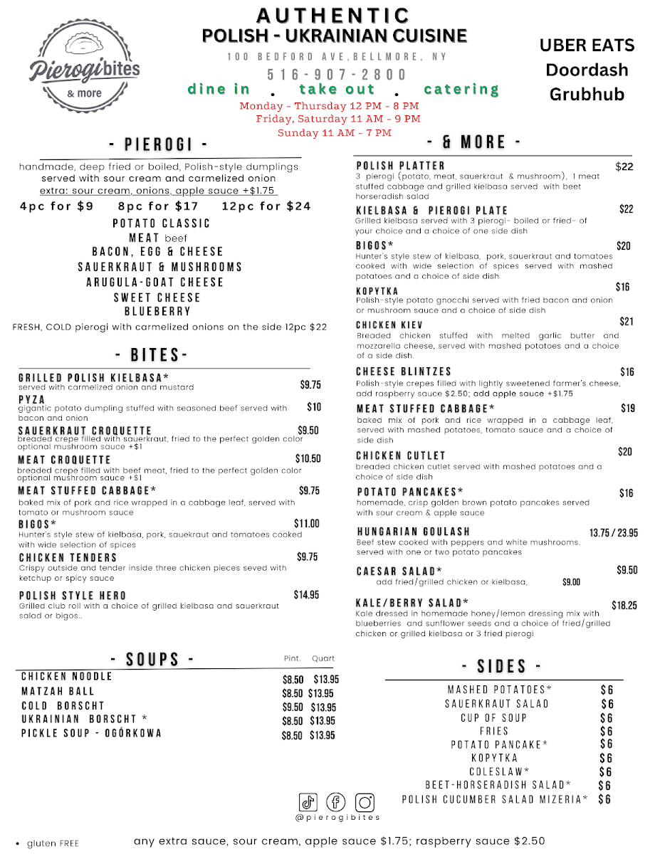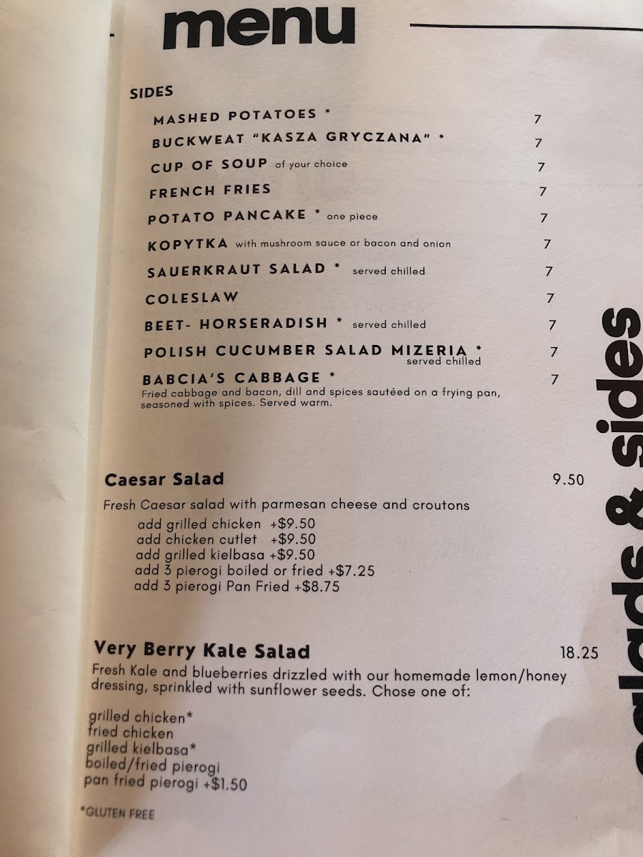 Grilled kielbasa with 3 pierogi of your choice - boiled or fried served with potato pancake and a choice of salad from "salad side" 4oz, mustard and apple sauce. Pan Fried pierogi + $1.50