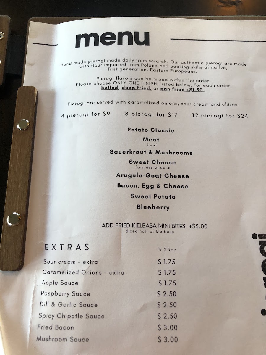 Homemade pierogi made daily from scratch. Our authentic pierogi are made with flour imported from Poland and cooking skills of native, first generation, Eastern Europeans. Pierogi flavors can be mixed within the order. Please choose ONLY ONE FINISH, listed below, for each order. boiled, deep fried, or pan fried +$1.50 Pierogi are served with caramelized onions, sour cream and chives. Picture shows Pan Fried Pierogi.